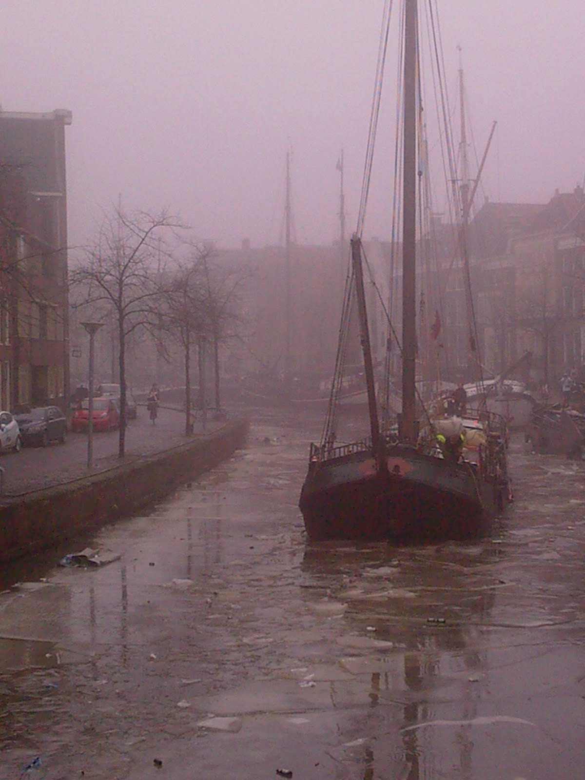 Het eerste schip dit jaar door de A-brug in de binnenstad werd door mij ''behandeld''. Het ging om het charterschip de Spes Mea die moeizaam zijn weg vervolgde, na vast ingevroren te zijn blijven liggen na de Winter Welvaart manifestatie